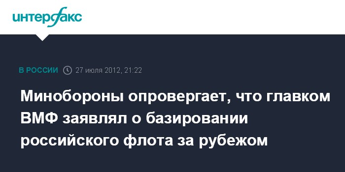 Москва. 27 июля. INTERFAX.RU - Сообщения СМИ со ссылкой якобы на заявление главкома ВМФ вице-адмирала Виктора Чиркова о том, что Россия ведет переговоры о возможности базирования кораблей ВМФ за рубежом, не соответствуют действительности, сообщили "Интерфаксу" в пятницу в управлении пресс-службы и информации Минобороны РФ.