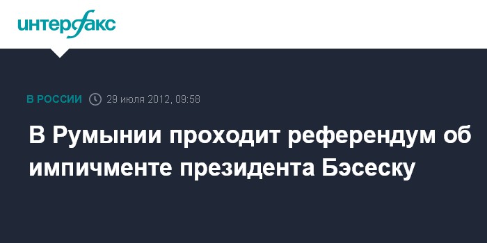 Лондон. 29 июля. INTERFAX.RU - Избирательные участки открылись в воскресенье в Румынии, где начался всенародный референдум об окончательном смещении президента Трайана Бэсеску, сообщает британская телерадиовещательная корпорация Би-би-си. Ранее парламент Румынии отстранил Т.Бэсеску от исполнения своих обязанностей.
