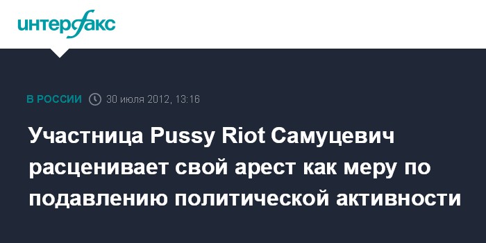 Москва. 30 июля. INTERFAX.RU - Одна из участниц группы Pussy Riot Екатерина Самуцевич считает свой арест частью репрессивных мер по снижению политической активности граждан.