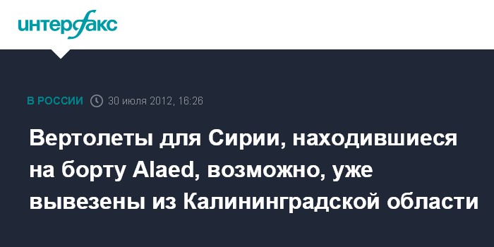 Калининград. 30 июля. INTERFAX.RU - Вертолеты Ми-25 армии Сирии, выгруженные с борта Alaed, в порту Балтийск, возможно, уже вывезены с территории Калининградской области, заявил "Интерфаксу" источник в транспортном комплексе Калининградской области
