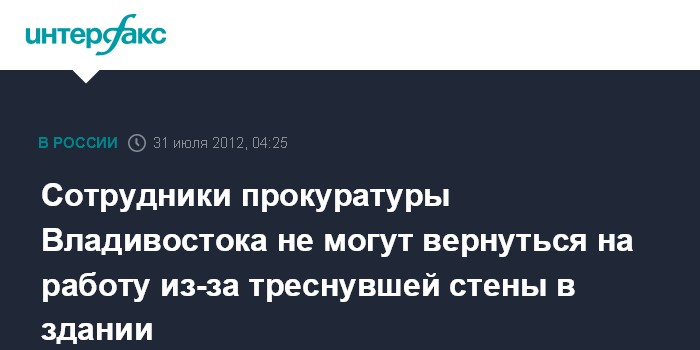Владивосток. 31 июля. ИНТЕРФАКС-ДАЛЬНИЙ ВОСТОК - Сотрудники прокуратуры Владивостока во вторник не смогли вернуться на работу из-за треснувшей накануне стены в здании прокуратуры, сообщил агентству "Интерфакс–Дальний Восток" во вторник представитель правоохранительных органов.