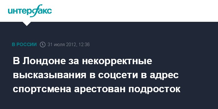 Москва. 31 июля. INTERFAX.RU - Британская полиция задержала 17-летнего подростка, допустившего оскорбительные комментарии в сети Twitter в адрес 18-летнего участника Олимпиады Тома Дэйли, сообщает AP.
