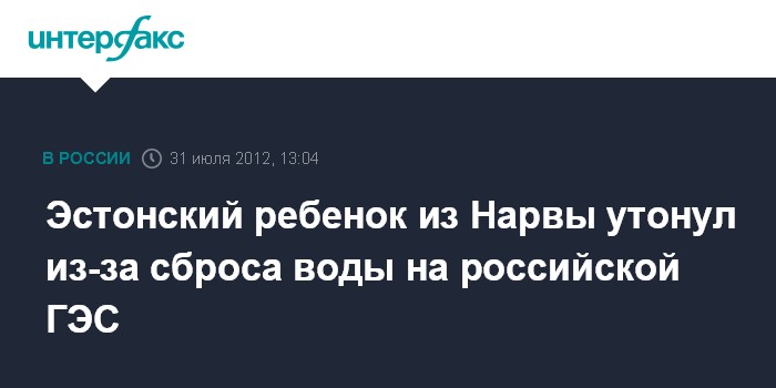 Таллин. 31 июля. INTERFAX.RU - Сброс воды на Нарвской ГЭС в российском городе Ивангород привел к гибели ребенка из Нарвы на эстонской стороне пограничной реки Нарова, еще двух детей удалось спасти, сообщила во вторник местная газета "Северное побережье".