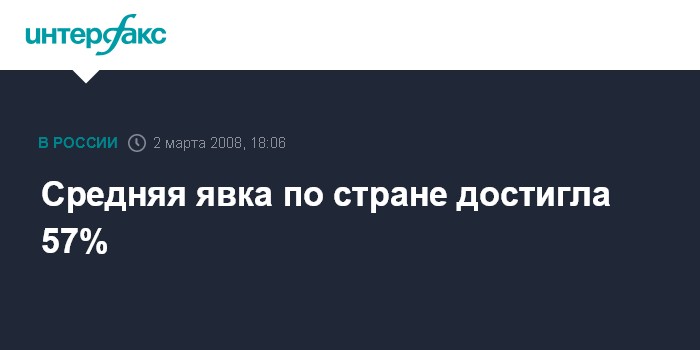 Москва. 2 марта. INTERFAX.RU - К 17:00 мск средняя явка избирателей на выборах президента РФ составляет 57%, сообщил председатель ЦИК Владимир Чуров.