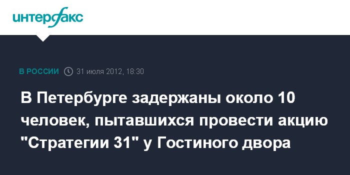 Санкт-Петербург. 31 июля. INTERFAX.RU - Полиция Петербурга не позволила провести акцию "Стратегии 31" у Гостиного двора, заявку на которую организаторы не подавали в Смольный.