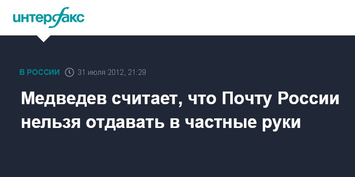 Как отметил Медведев, "это где-то в Швейцарии можно почту раздать в разные руки, а у нас страна такая, что ни один частник не потянет". "Почтой будем заниматься", - подчеркнул премьер.