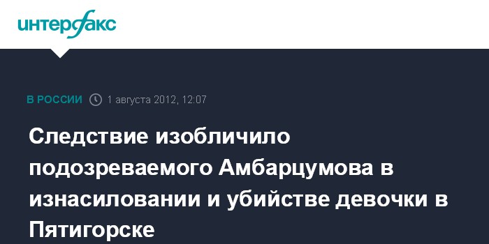 Москва. 1 августа. INTERFAX.RU - Подозреваемый в убийстве девочки в Пятигорске 40-летний Владимир Амбарцумов полностью изобличен доказательствами по делу, сообщил официальный представитель СК РФ Владимир Маркин.