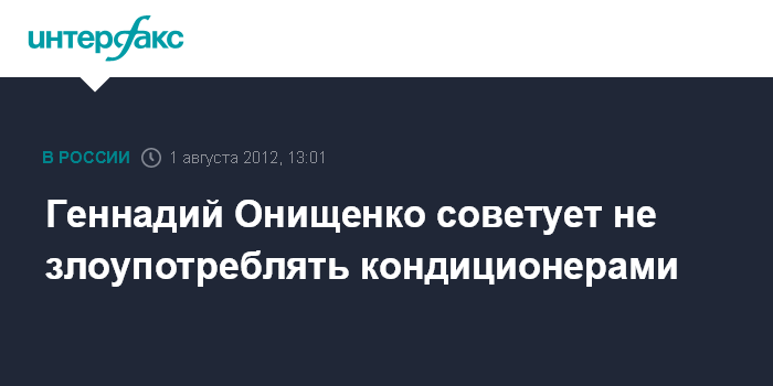 Москва. 1 августа. INTERFAX.RU - Руководитель Роспотребнадзора, главный государственный санитарный врач РФ Геннадий Онищенко заявил, что жаркая погода, установившаяся во многих российских регионах, не является поводом для того, чтобы злоупотреблять кондиционерами.