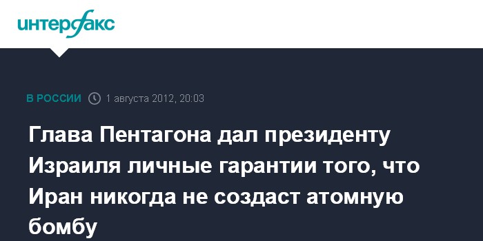 Иерусалим. 1 августа. INTERFAX.RU - Министр обороны США Леон Панетта лично гарантировал президенту Израиля Шимону Пересу, что Иран никогда не создаст атомную бомбу, сообщает в среду агентство ЭФЭ.