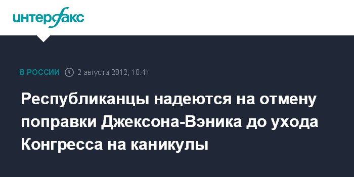 Вашингтон. 2 августа. INTERFAX.RU - Сторонники отмены поправки Джексона-Вэника в республиканском большинстве палаты представителей Конгресса США надеются на принятие законопроекта об ее отмене до ухода на каникулы, сообщает американская газета The Wall Street Journal.