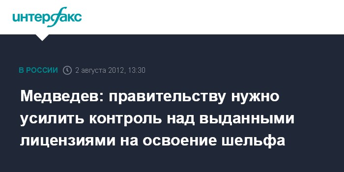 Москва. 2 августа. INTERFAX.RU - Премьер-министр РФ Дмитрий Медведев высказался за усиление контроля над выданными лицензиями на освоение участков континентального шельфа, отметив его должное отсутствие в настоящее время.