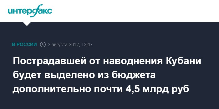 Москва. 2 августа. INTERFAX.RU - Правительство РФ дополнительно выделит Краснодарскому краю около 4,5 млрд рублей на строительство домов для пострадавших в результате наводнения на Кубани и расчистку русел рек.