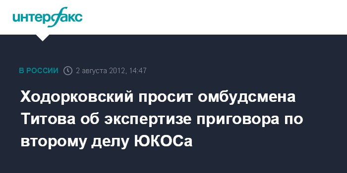 Москва. 2 августа. INTERFAX.RU - Бывший руководитель НК "ЮКОС" Михаил Ходорковский обратился к уполномоченному по защите прав предпринимателей Борису Титову с просьбой провести общественную экспертизы "второго приговора".