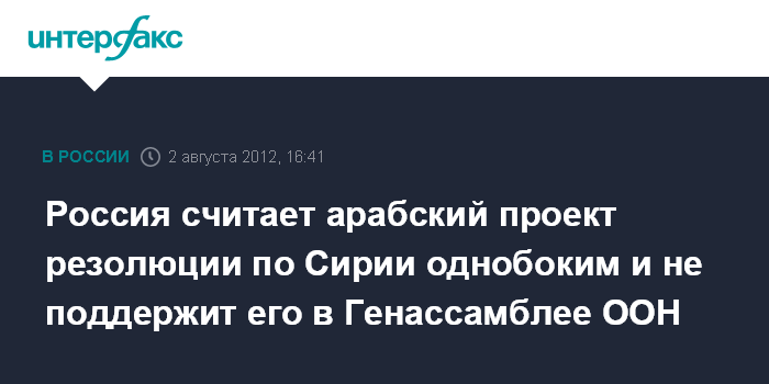 Москва. 2 августа. INTERFAX.RU - Россия не поддержит арабский проект резолюции по Сирии, который был внесен на рассмотрение Генассамблеи ООН, так как он носит несбалансированный характер, заявили в МИД РФ.