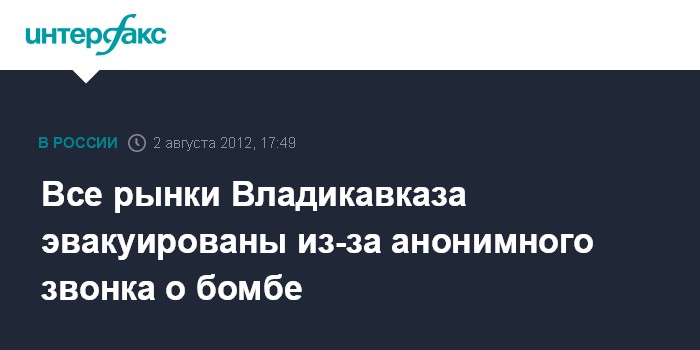 Владикавказ. 2 августа. INTERFAX.RU - Все рынки Владикавказа в четверг вечером проверяют после звонка анонима о минировании одного из них, сообщает пресс-служба МВД по Северной Осетии.