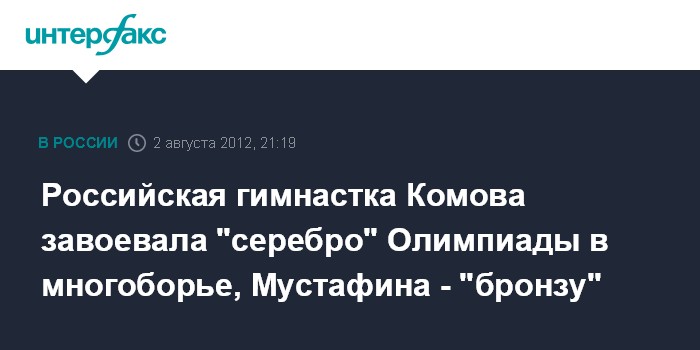 Москва. 2 августа. INTERFAX.RU - Россиянка Виктория Комова стала серебряным призером олимпийских соревнований по спортивной гимнастике в многоборье, а ее соотечественница Алия Мустафина завоевала "бронзу".