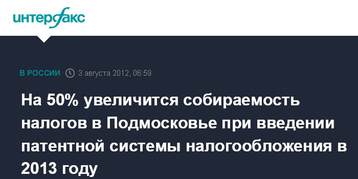 Красногорск. 3 августа. ИНТЕРФАКС-ЦЕНТР - Введение в 2013 году патентной системы налогообложения увеличит собираемость налогов в Московской области на 40-50%, сообщает пресс-служба правительства региона.