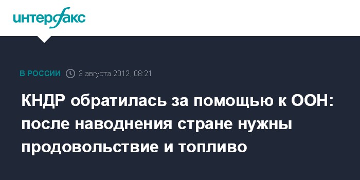 Лондон. 3 августа. INTERFAX.RU - Организация Объединенных Наций сообщила, что Северная Корея обратилась к ней за помощью после разрушительных наводнений, произошедших в прошлом месяце, в результате которых были затоплены многие сельскохозяйственные земли.