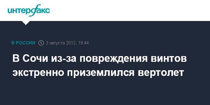 Он отметил, что, по предварительной версии, вертолет сделал экстренную посадку в горах в районе поселка Эсто-Садок по техническим причинам. Пострадавших нет. "У вертолета имеются повреждения винтов", - подчеркнул представитель прокуратуры.