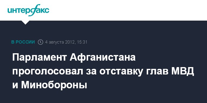Исламабад. 4 августа. INTERFAX.RU - Афганские депутаты в ходе заседания парламента в субботу проголосовали за отстранение от должностей министра внутренних дел Бисмиллаха Мохаммади и министра обороны Афганистана Абдула Рахима Вардака, сообщает пакистанская газета "Дон". "Обоим министрам не удалось заручиться доверием парламента, поэтому мы просим президента страны Хамида Карзая представить кандидатуры новых министров", - приводит издание слова спикера нижней палаты афганского парламента Абдула Рахуфа Ибрахими.