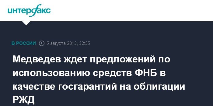 Омск. 5 августа. ИНТЕРФАКС - Премьер-министр РФ Дмитрий Медведев дал поручение соответствующим ведомствам правительства подготовить предложения по использованию средств Фонда национального благосостояния в качестве госгарантий на облигации "РЖД".