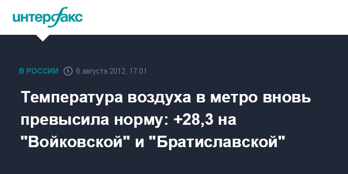 Москва. 6 августа. INTERFAX.RU - На нескольких станциях столичного метрополитена в понедельник температура воздуха превысила установленные санитарными нормами 28 градусов.