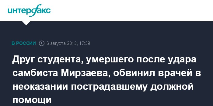 Москва. 6 августа. INTERFAX.RU - Друг студента Ивана Агафонова, погибшего после драки с самбистом Расулом Мирзаевым, в суде заявил, что врачи Первой градской больницы не оказали пострадавшему своевременную помощь.