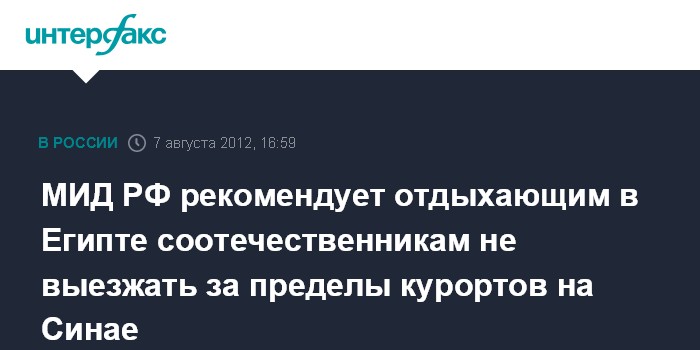 "МИД России подтверждает рекомендацию российским гражданам, посещающим Египет в туристических целях, проявлять необходимую осмотрительность и воздерживаться от поездок за пределы курортных зон на Синайском полуострове", - говорится в сообщении МИД РФ, распространенном во вторник.