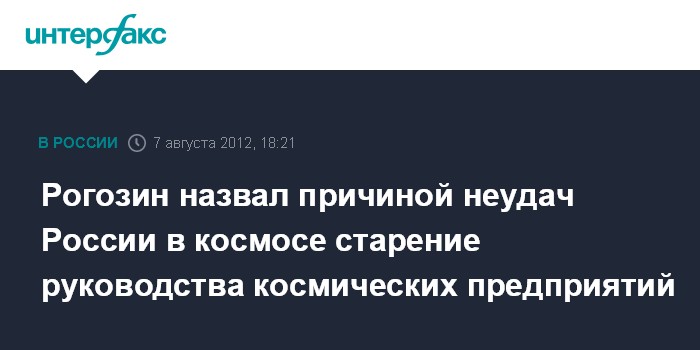 Москва. 7 августа. INTERFAX.RU - Вице-премьер РФ Дмитрий Рогозин считает одной из причин последних космических аварий старение руководящих кадров предприятий ракетно-космической отрасли.