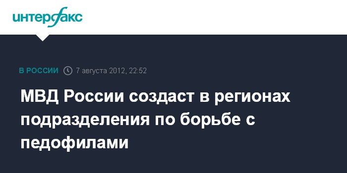Москва. 7 августа. INTERFAX.RU - Подразделения по борьбе с педофилами в ближайшее время будут созданы во всех региональных органах внутренних дел, сообщили "Интерфаксу" в пресс-центре МВД России.