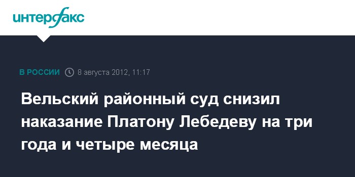 Вельск. 8 августа. INTERFAX.RU - Вельский районный суд в среду снизил срок наказания экс-главе МФО ""МЕНАТЕП" Платону Лебедеву на три года и четыре месяца, передал корреспондент "Интерфакса".
