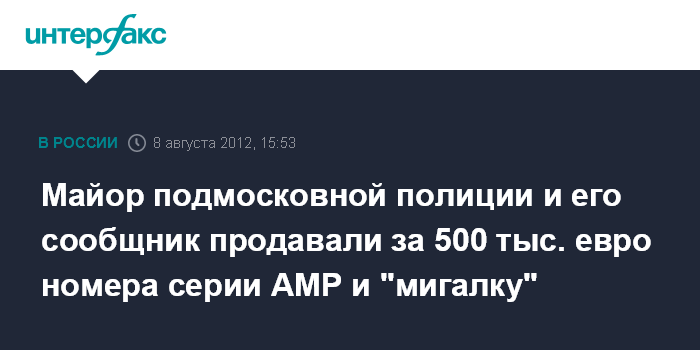 Москва. 8 августа. INTERFAX.RU - Офицер и бывший прапорщик полиции задержаны в Московской области по подозрению в мошенничестве, связанном с выдачей спецсигналов на автомобили и номеров престижной серии АМР за полмиллиона евро, сообщили в пресс-центре МВД РФ.