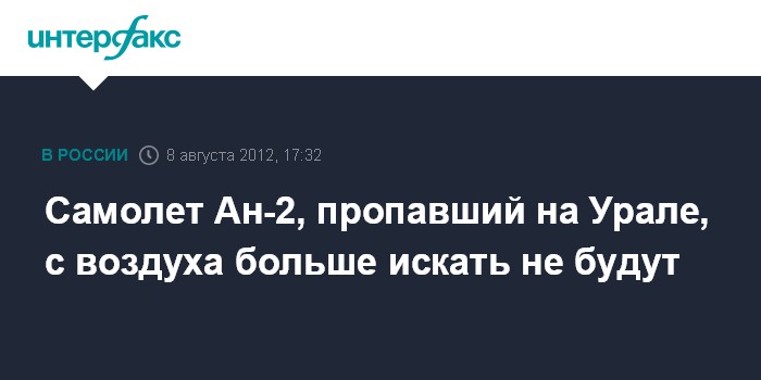 Москва.8 августа. INTERFAX.RU - Воздушная операция по поиску пропавшего на Урале самолета Ан-2 прекращена, сообщил "Интерфаксу" источник в авиадиспетчерских службах Свердловского авиаузла.