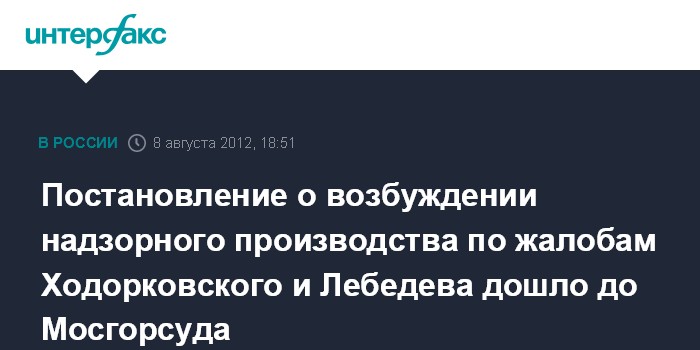 Постановление о возбуждении надзорного производства по жалобам Ходорковского и Лебедева дошло до Мосгорсуда