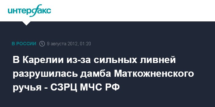 "По информации, полученной от диспетчера карельского регионального диспетчерского управления, в результате обильных осадков произошло накопление воды, последующий перелив и разрушение дамбы старого русла Маткожненского ручья", - сообщили "Интерфаксу" в четверг в северо-западном региональный центр МЧС РФ.
