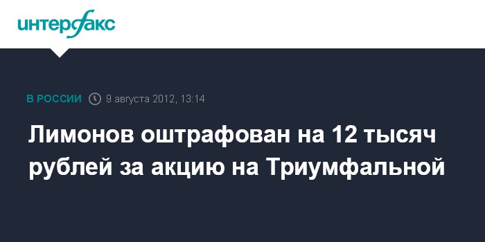 Москва. 9 августа. INTERFAX.RU - Мировой участок Тверского суда Москвы оштрафовал на 12 тысяч рублей лидера незарегистрированной партии "Другая Россия" Эдуарда Лимонова за организацию акции 31 июля на Триумфальной площади.