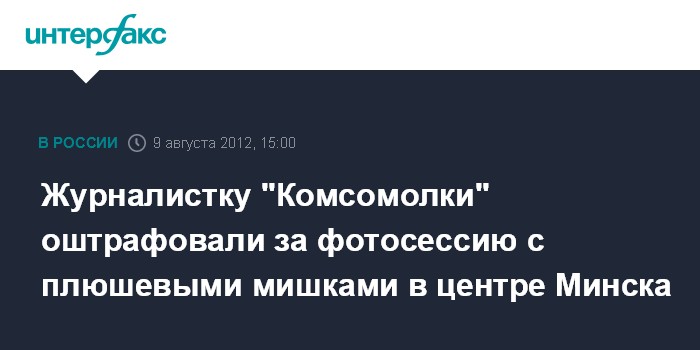Минск. 9 августа. INTERFAX.RU - Суд Советского района Минска назначил штраф в размере 30 базовых величин журналистке "Комсомольской правды в Беларуси" Ирине Козлик за фотосессию с плюшевыми мишками, сообщили агентству "Интерфакс-Запад" в четверг в Белорусской ассоциации журналистов (БАЖ).