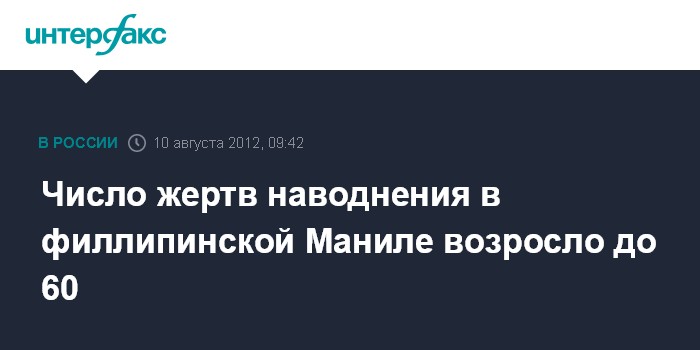 Манила. 10 августа. ИНТЕРФАКС - Число погибших от наводнения в столице Филиппин достигло 60 человек, сообщают в пятницу местные СМИ.