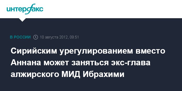 Париж. 10 августа. INTERFAX.RU - Новым спецпосланником ООН и Лиги арабских государств (ЛАГ) по Сирии, как ожидается, станет бывший министр иностранных дел Алжира Лахдар Ибрахими, сообщают в пятницу западные СМИ со ссылкой на дипломатов ООН.