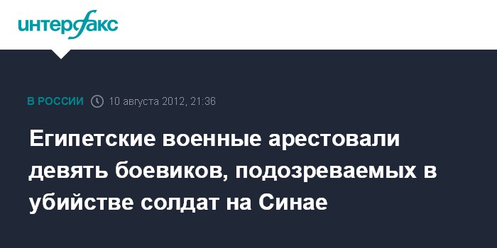 Каир. 10 августа. INTERFAX.RU - Египетские военные и сотрудники спецслужб арестовали в провинции Северный Синай девять боевиков, подозреваемых в нападении на армейские КПП и убийстве 16 солдат, сообщает в пятницу египетская газета "Аль-Масри аль-Яум".
