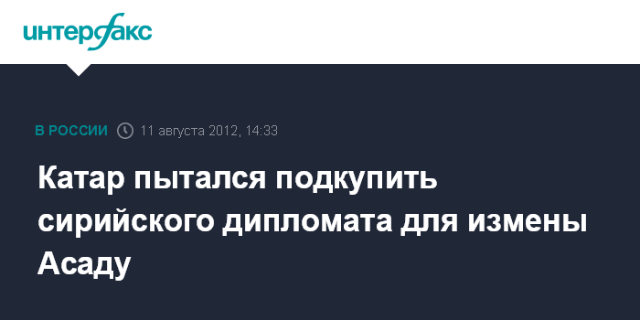 Бейрут. 11 августа. INTERFAX.RU - Сирийский посол в Мавритании Хамад Сид Альбни отверг предложение Катара перейти на сторону оппозиции в обмен на сумму в миллион долларов и политическое убежище в катарской столице Дохе, сообщил в субботу ливанский телеканал "Аль-Манар".