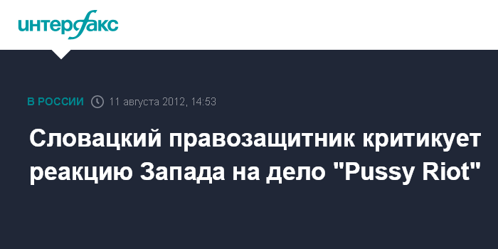 Москва. 11 августа. INTERFAX.RU - Словацкий эксперт правозащитного Фонда в защиту свободы (США) Роджер Кишка подверг критике реакцию Запада на дело группы "Pussy Riot". "Как адвокат по правам человека, специализирующийся на вопросах свободы вероисповедания и свободы слова, я наблюдаю за реакцией Запада на судебный процесс "Pussy Riot" с недоверием и разочарованием", - заявил Р.Кишка "Интерфакс-Религия".