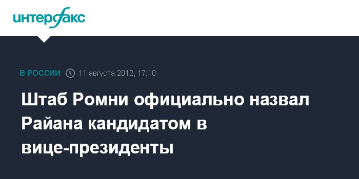 Вашингтон. 11 августа. INTERFAX.RU - Штаб участника президентской гонки от Республиканской партии Митта Ромни официально объявил конгрессмена Пола Райана кандидатом в вице-президенты страны США, сообщает в субботу газета "Вашингтон пост". Ожидается, что в ближайшие минуты сам М.Ромни еще раз объявит об этом на специальной церемонии в городе Норфолк, штат Вирджиния, которая начнется в субботу в 9 часов утра по местному времени (17:00 мск).