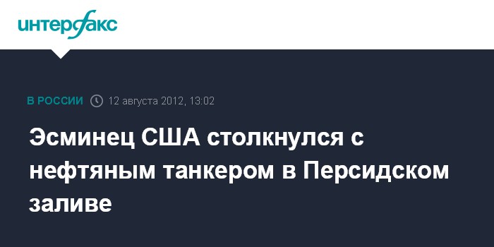 Вашингтон. 12 августа. INTERFAX.RU - Эсминец США USS Porter столкнулся с панамским нефтяным танкером в Персидском заливе, сообщили в воскресенье в ВМС США. В результате столкновения никто не пострадал. На данный момент оценивается ущерб, нанесенный американскому кораблю, и выясняются причины инцидента, отмечается в сообщении.