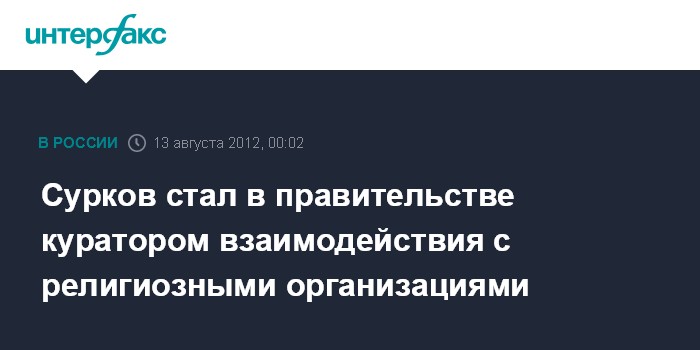 Москва. 13 августа. INTERFAX.RU - Вопросы взаимодействия с религиозными организациями теперь курирует в правительстве РФ вице-премьер - глава аппарата правительства Владислав Сурков.