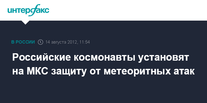 Москва. 14 августа. INTERFAX.RU - Российские космонавты Геннадий Падалка и Юрий Маленченко 20 августа выйдут в открытый космос и установят противометероидные панели на внешней поверхности Международной космической станции (МКС), сообщили "Интерфаксу" в Центре управления полетами (ЦУП) (Королев, Московская область).