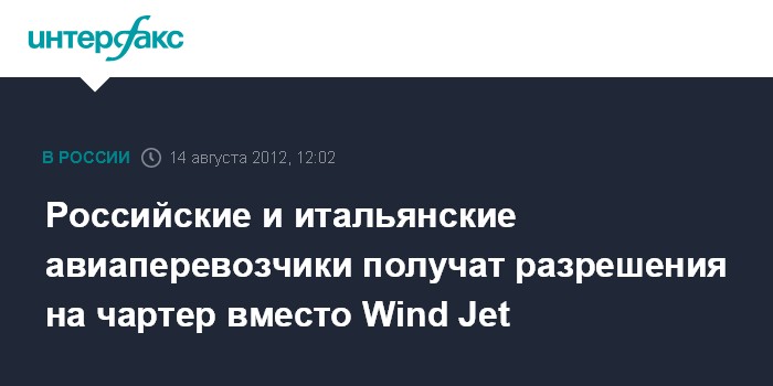 Москва. 14 августа. INTERFAX.RU - Росавиация готова предоставить российским и итальянским авиаперевозчикам разрешения на чартерные рейсы для перевозки пассажиров авиакомпании Wind Jet, которая прекратила выполнение полетов, говорится в сообщении агентства.