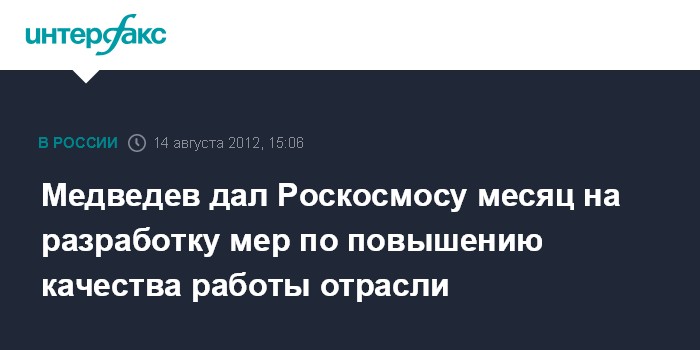 Горки. 14 августа. INTERFAX.RU - Премьер-министр РФ Дмитрий Медведев поручил на правительственном уровне за месяц проработать вопросы контроля за качеством продукции, выпускаемой предприятиями космической отрасли.