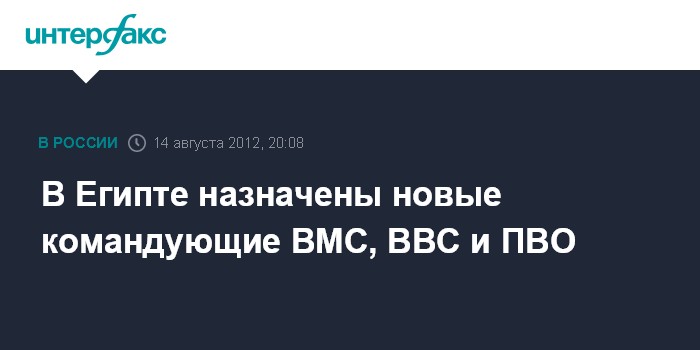 Каир. 14 августа. INTERFAX.RU - Президент Египта Мухаммед Мурси назначил новых командующих ВМС, ВВС и ПВО страны, сообщает во вторник официальное египетское агентство MENA.