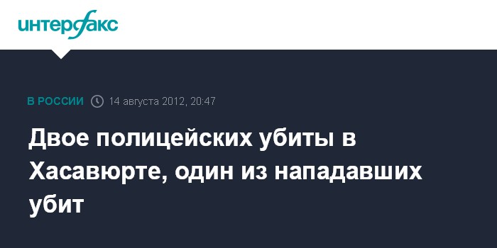 Москва. 14 августа. INTERFAX.RU - В дагестанском Хасавюрте во вторник вечером убиты двое сотрудников полиции, сообщил "Интерфаксу" источник в правоохранительных органах.